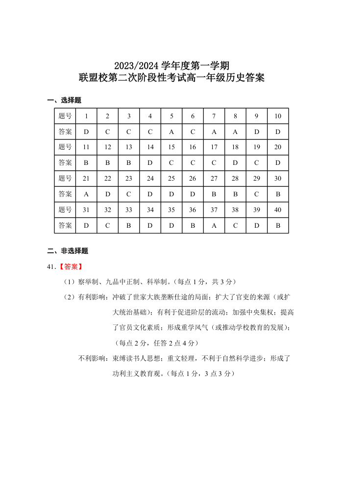 江苏省盐城市五校联考2024-2025学年高一上学期12月月考历史答案