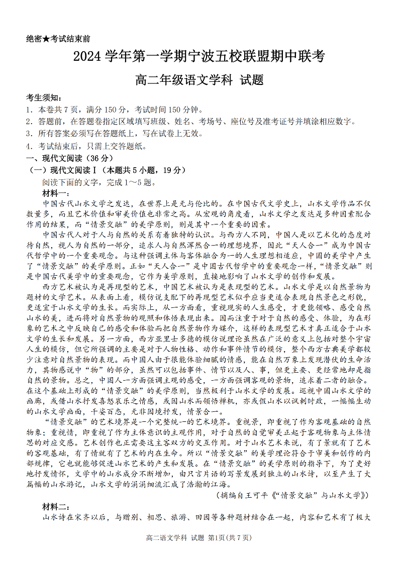 浙江省2024学年第一学期宁波五校联盟期中联考语文