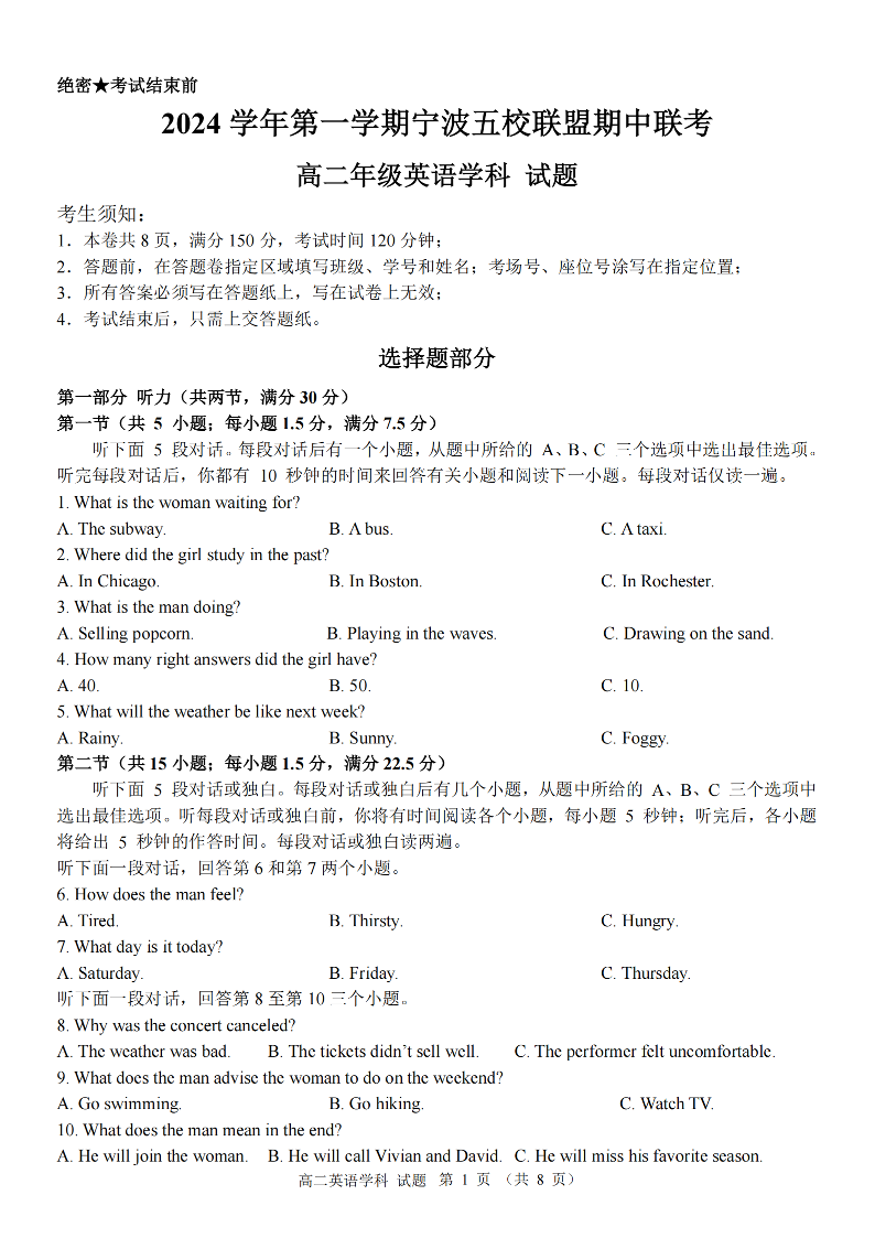 浙江省2024学年第一学期宁波五校联盟期中联考英语