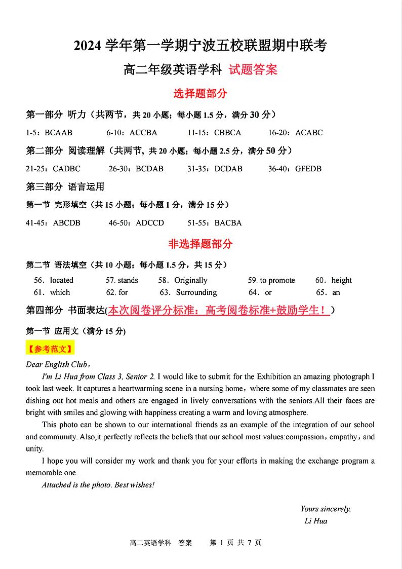 浙江省2024学年第一学期宁波五校联盟期中联考英语答案