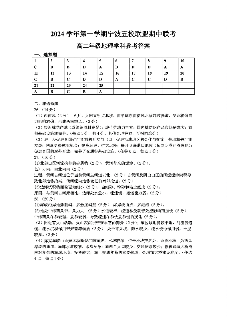 浙江省2024学年第一学期宁波五校联盟期中联考地理答案