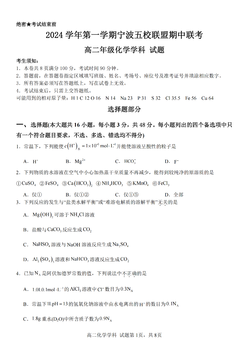 浙江省2024学年第一学期宁波五校联盟期中联考化学