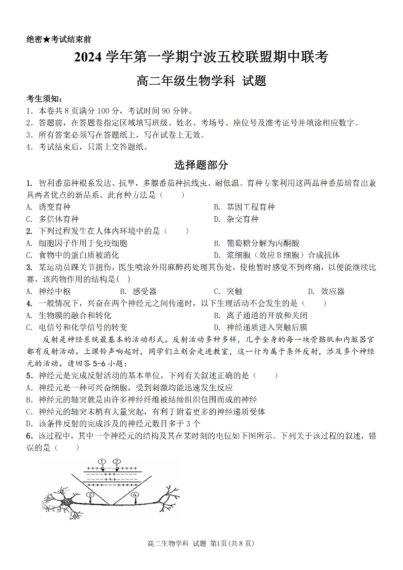浙江省2024学年第一学期宁波五校联盟期中联考生物