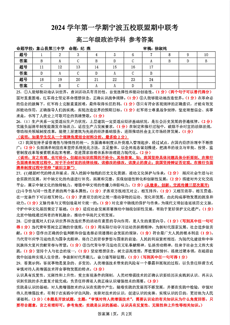 浙江省2024学年第一学期宁波五校联盟期中联考政治答案