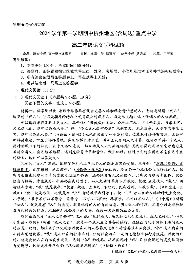 浙江省杭州地区(含周边)重点中学2024学年第一学期期中考试语文