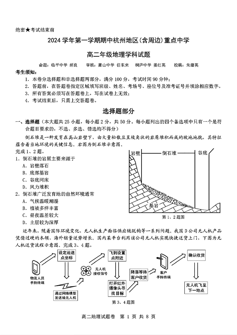 浙江省杭州地区(含周边)重点中学2024学年第一学期期中考试地理
