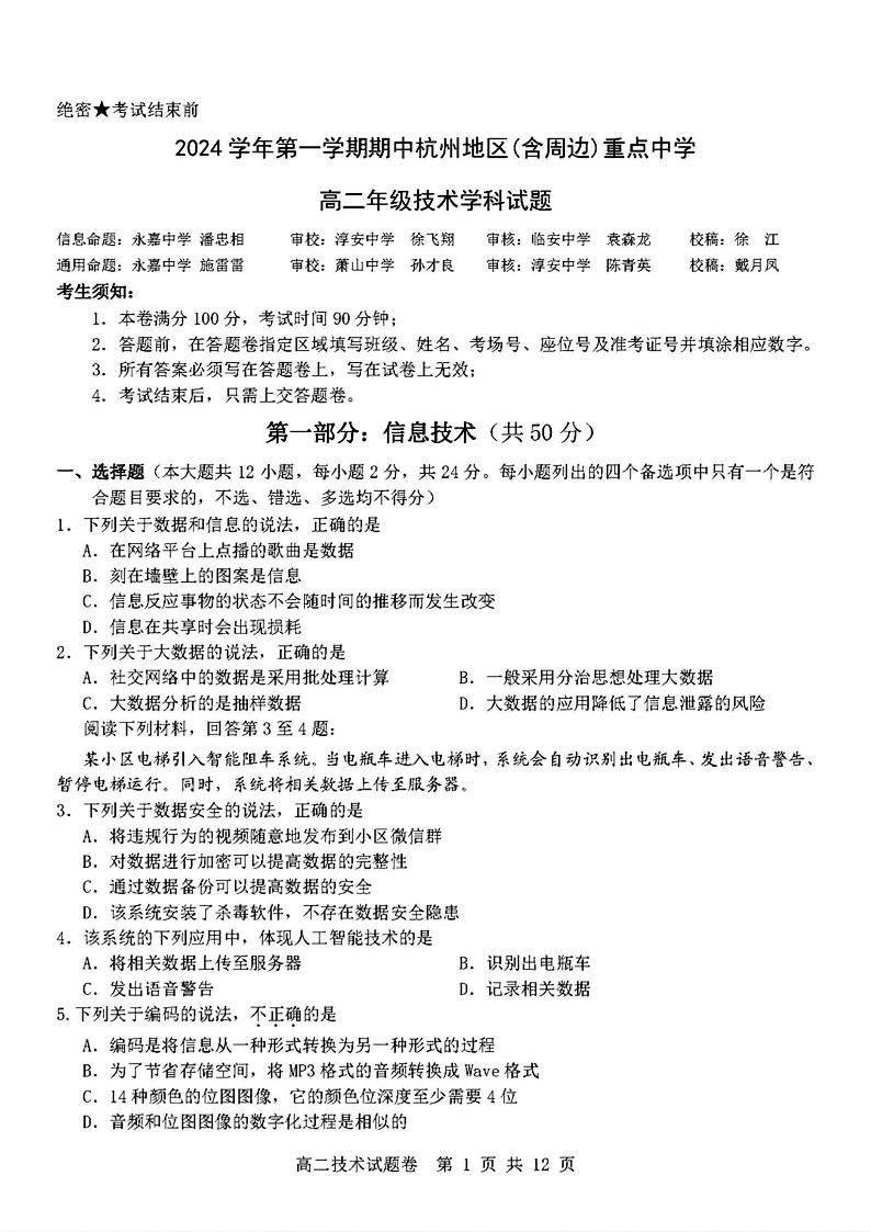 浙江省杭州地区(含周边)重点中学2024学年第一学期期中考试技术