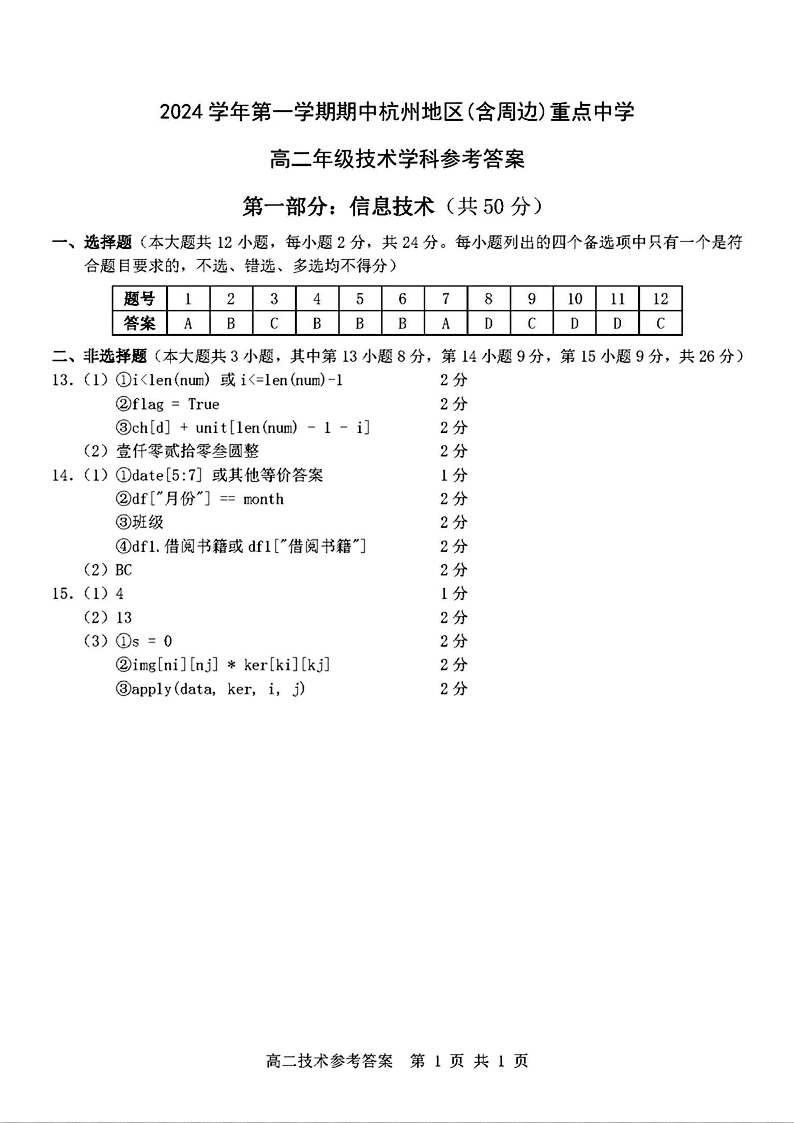 浙江省杭州地区(含周边)重点中学2024学年第一学期期中考试技术答案