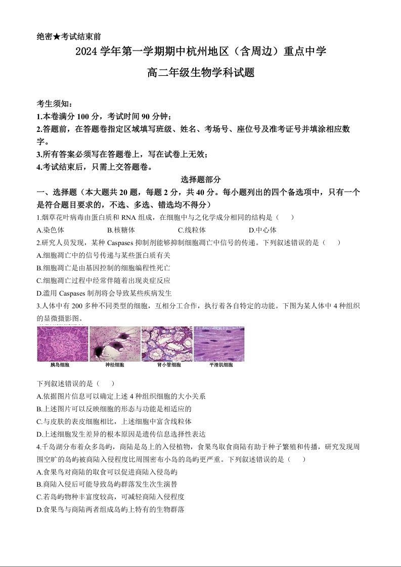 浙江省杭州地区(含周边)重点中学2024学年第一学期期中考试生物+答案
