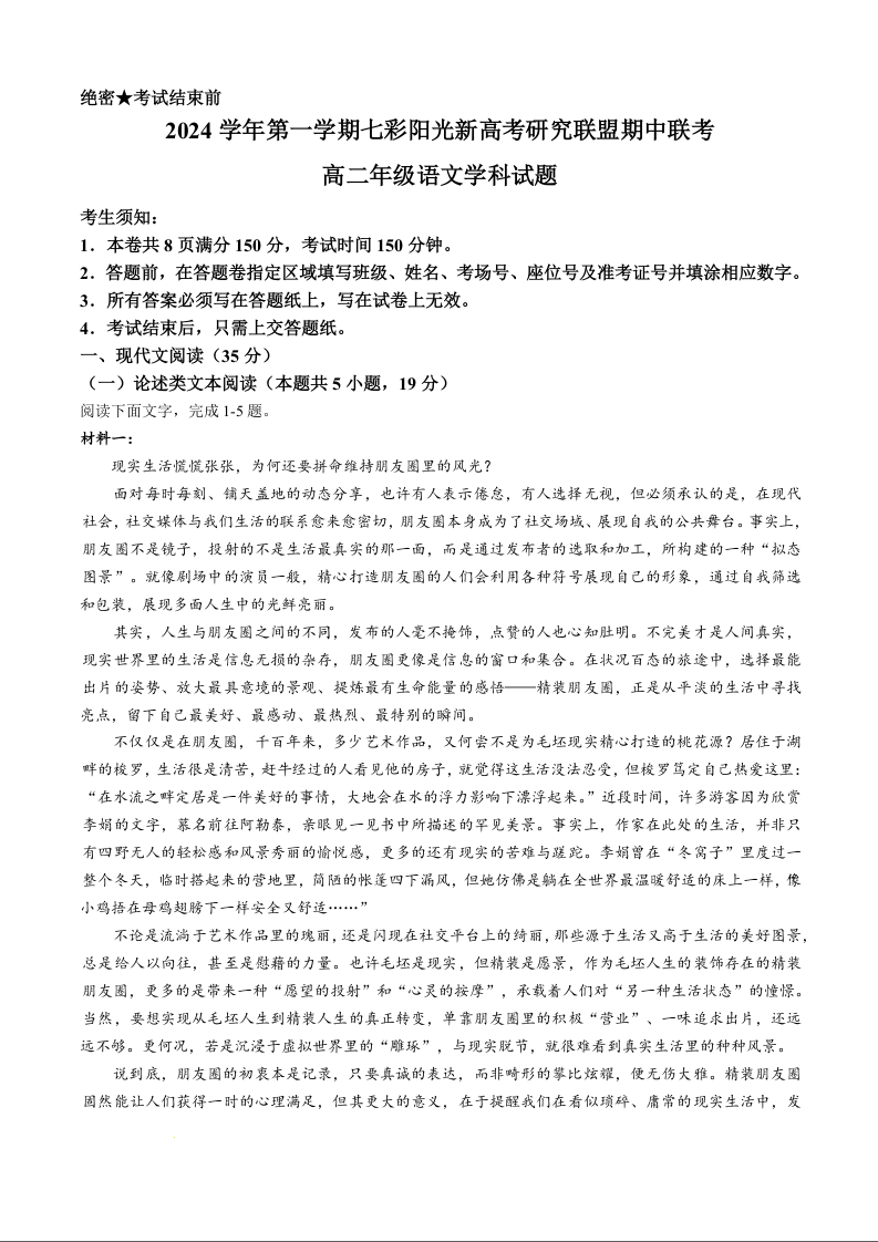 浙江省七彩阳光新高考研究联盟2024学年第一学期期中联考语文+答案