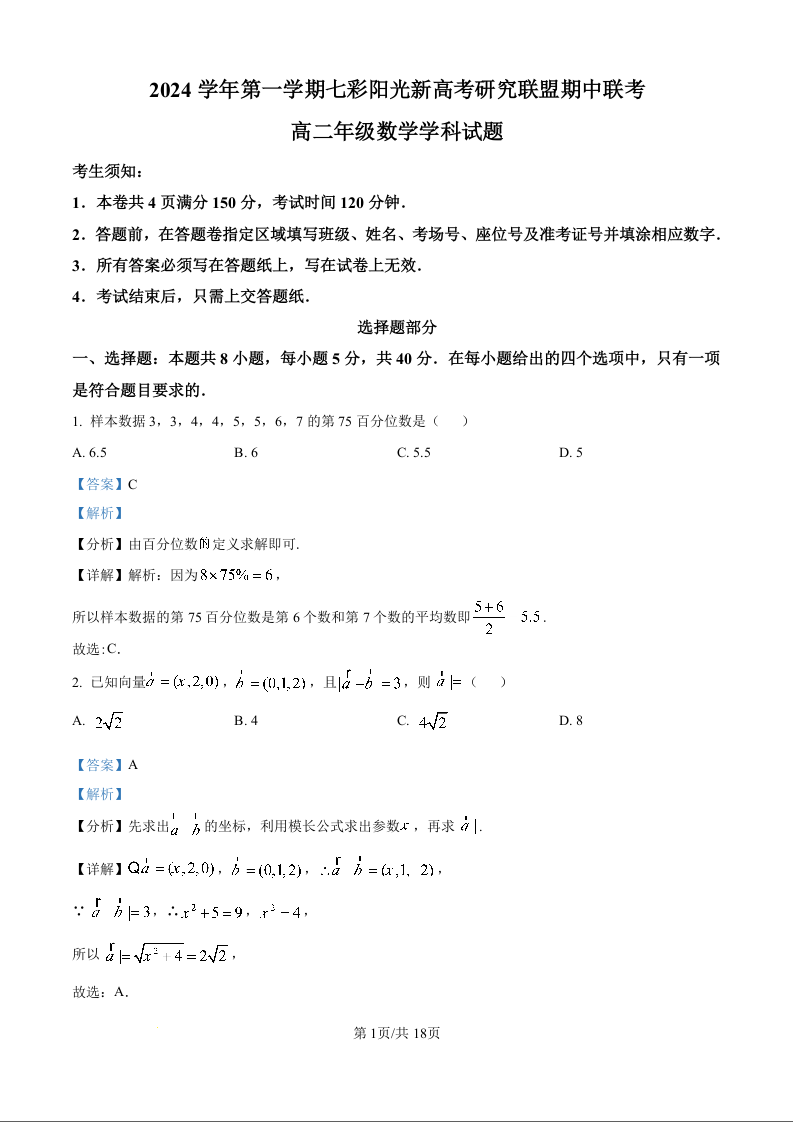 浙江省七彩阳光新高考研究联盟2024学年第一学期期中联考数学试题(解析版)
