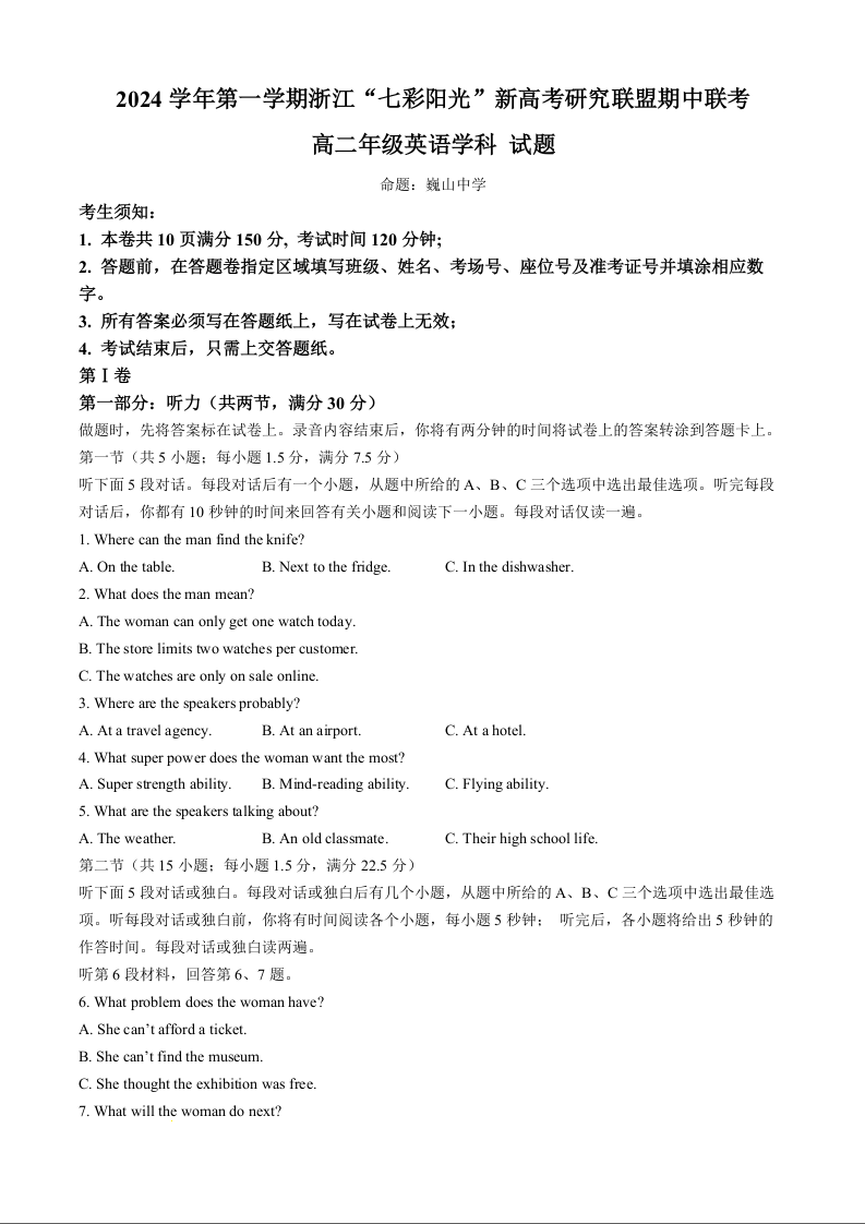 浙江省七彩阳光新高考研究联盟2024学年第一学期期中联考英语+答案