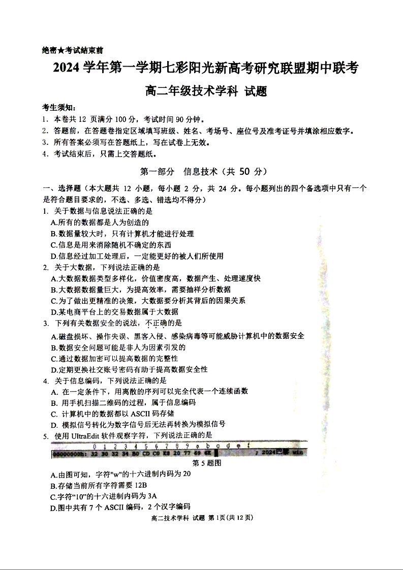 浙江省七彩阳光新高考研究联盟2024学年第一学期期中联考通用技术
