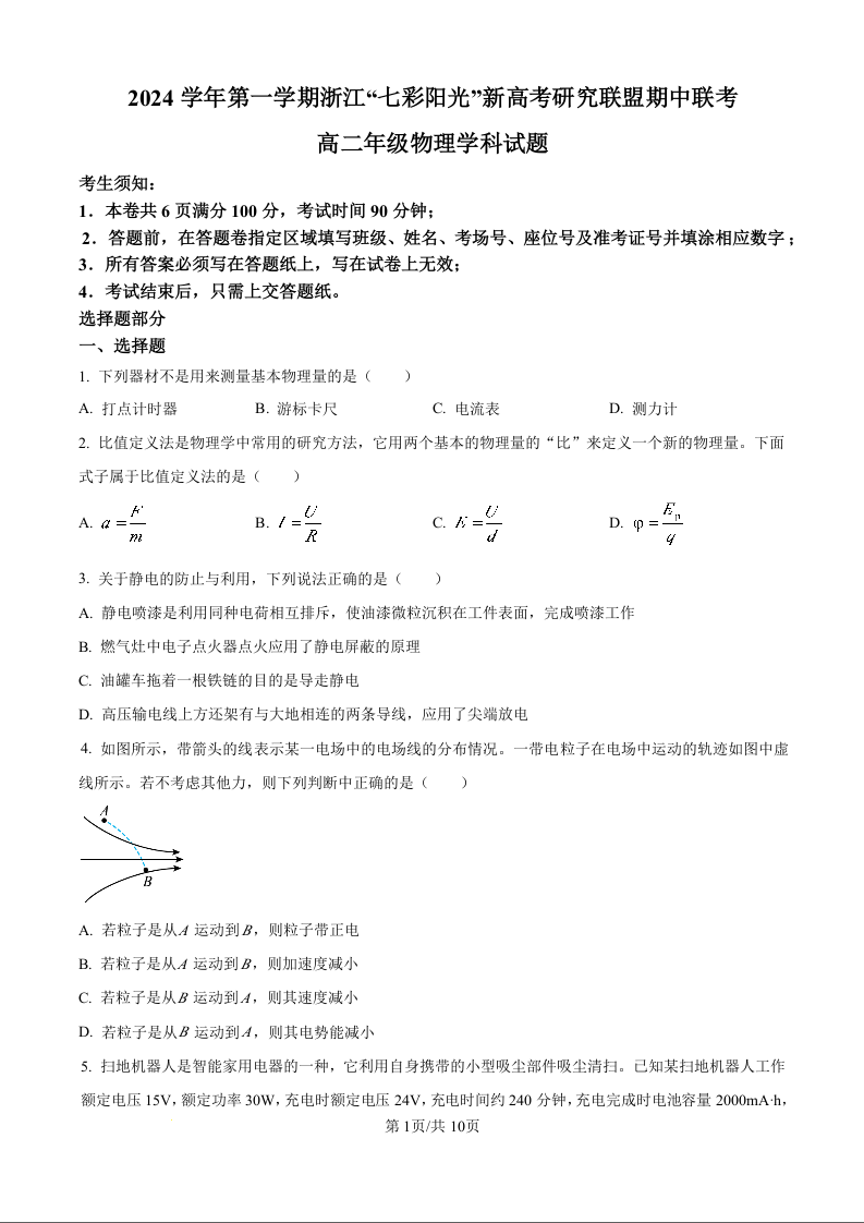 浙江省七彩阳光新高考研究联盟2024学年第一学期期中联考物理试题(原卷版)