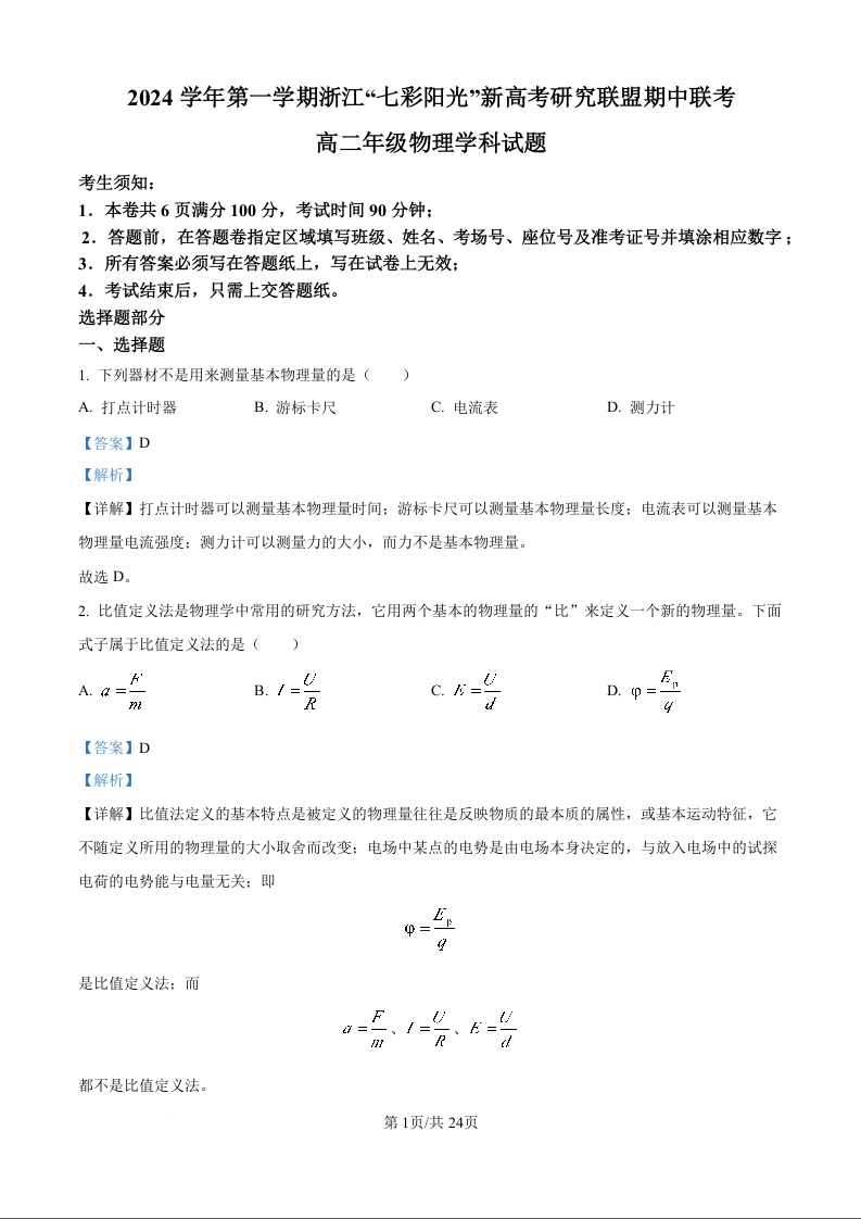 浙江省七彩阳光新高考研究联盟2024学年第一学期期中联考物理试题(解析版)