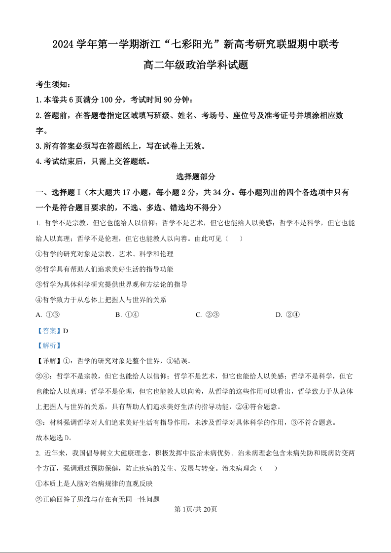 浙江省七彩阳光新高考研究联盟2024学年第一学期期中联考政治试题(解析版)