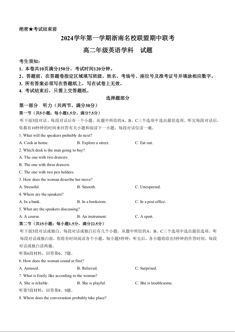 浙江省浙南名校联盟2024学年第一学期期中联考英语+答案