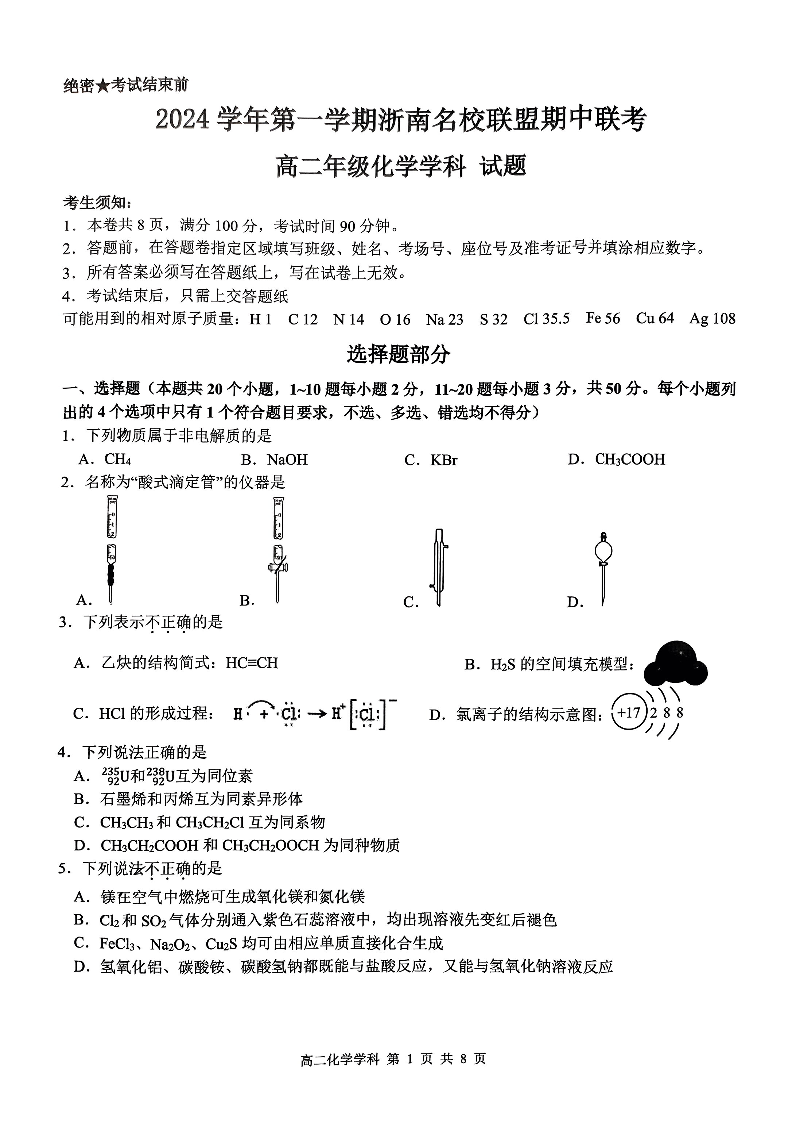 浙江省浙南名校联盟2024学年第一学期期中联考化学