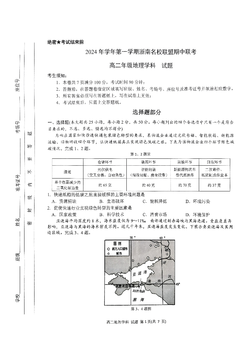 浙江省浙南名校联盟2024学年第一学期期中联考地理