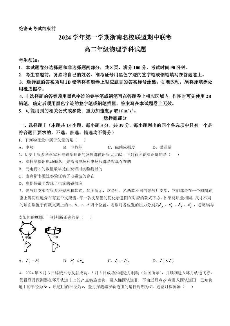 浙江省浙南名校联盟2024学年第一学期期中联考物理+答案