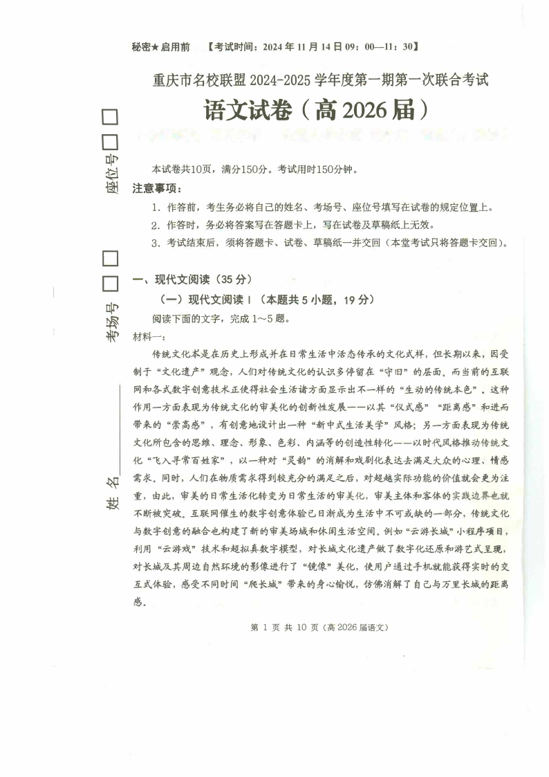 重庆市名校联盟2024-2025学年度第一期第一次联合考试语文+答案