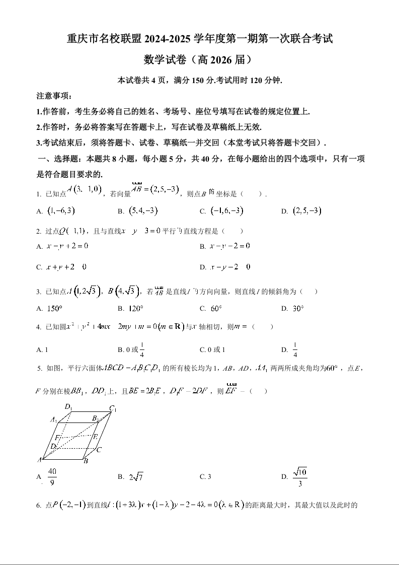 重庆市名校联盟2024-2025学年度第一期第一次联合考试数学+答案
