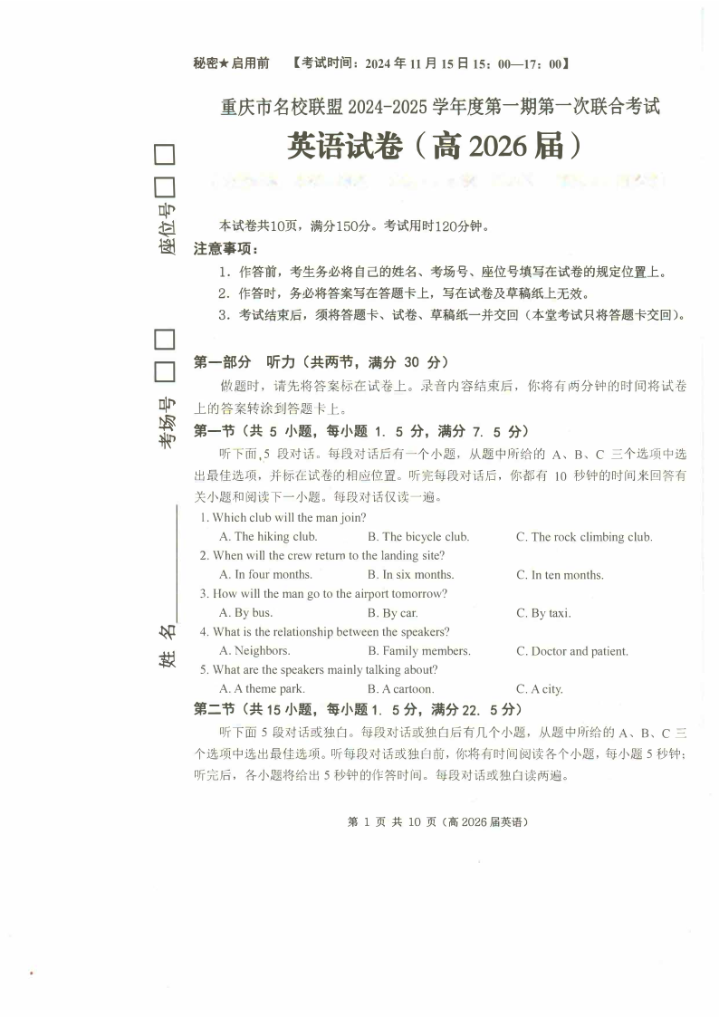重庆市名校联盟2024-2025学年度第一期第一次联合考试英语+答案
