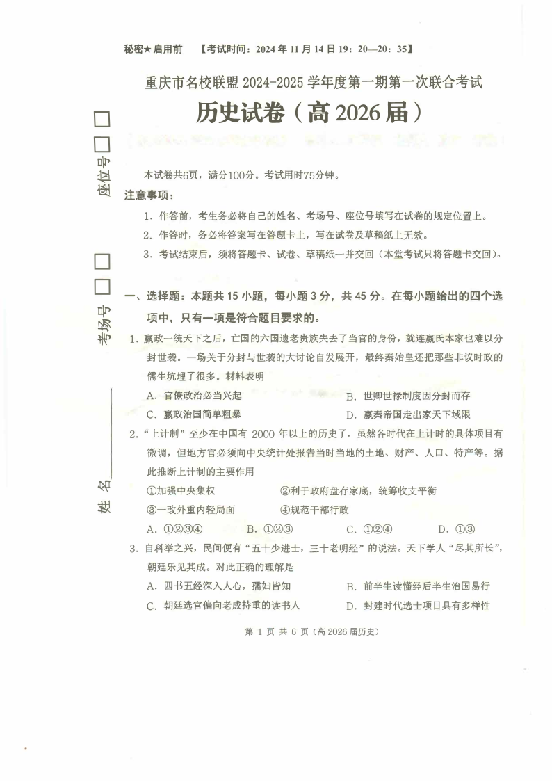 重庆市名校联盟2024-2025学年度第一期第一次联合考试历史+答案