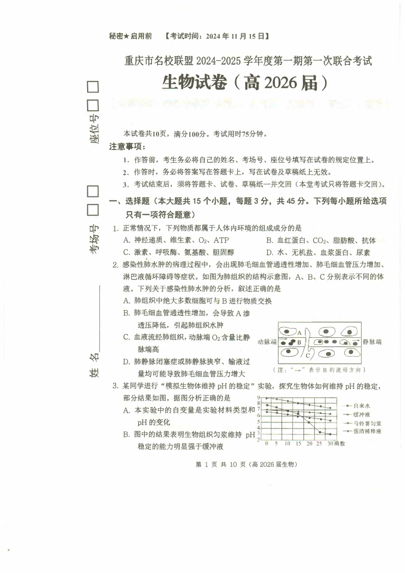 重庆市名校联盟2024-2025学年度第一期第一次联合考试生物+答案
