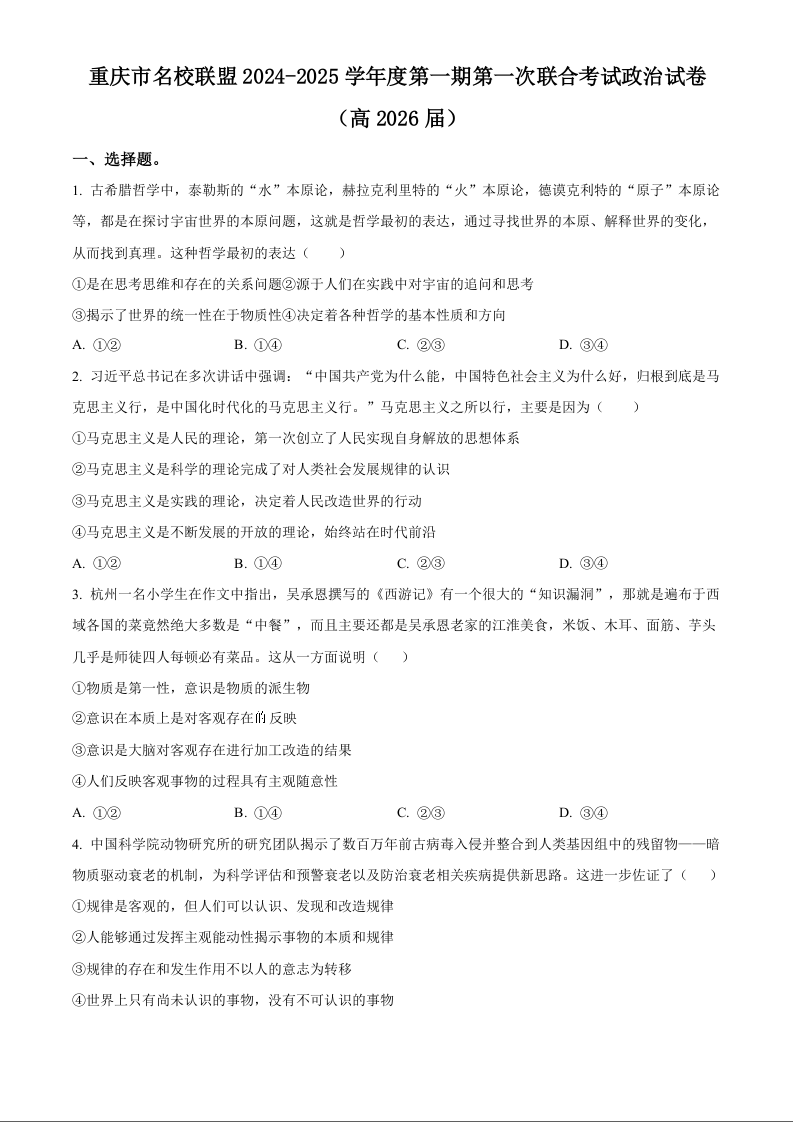 重庆市名校联盟2024-2025学年度第一期第一次联合考试政治+答案