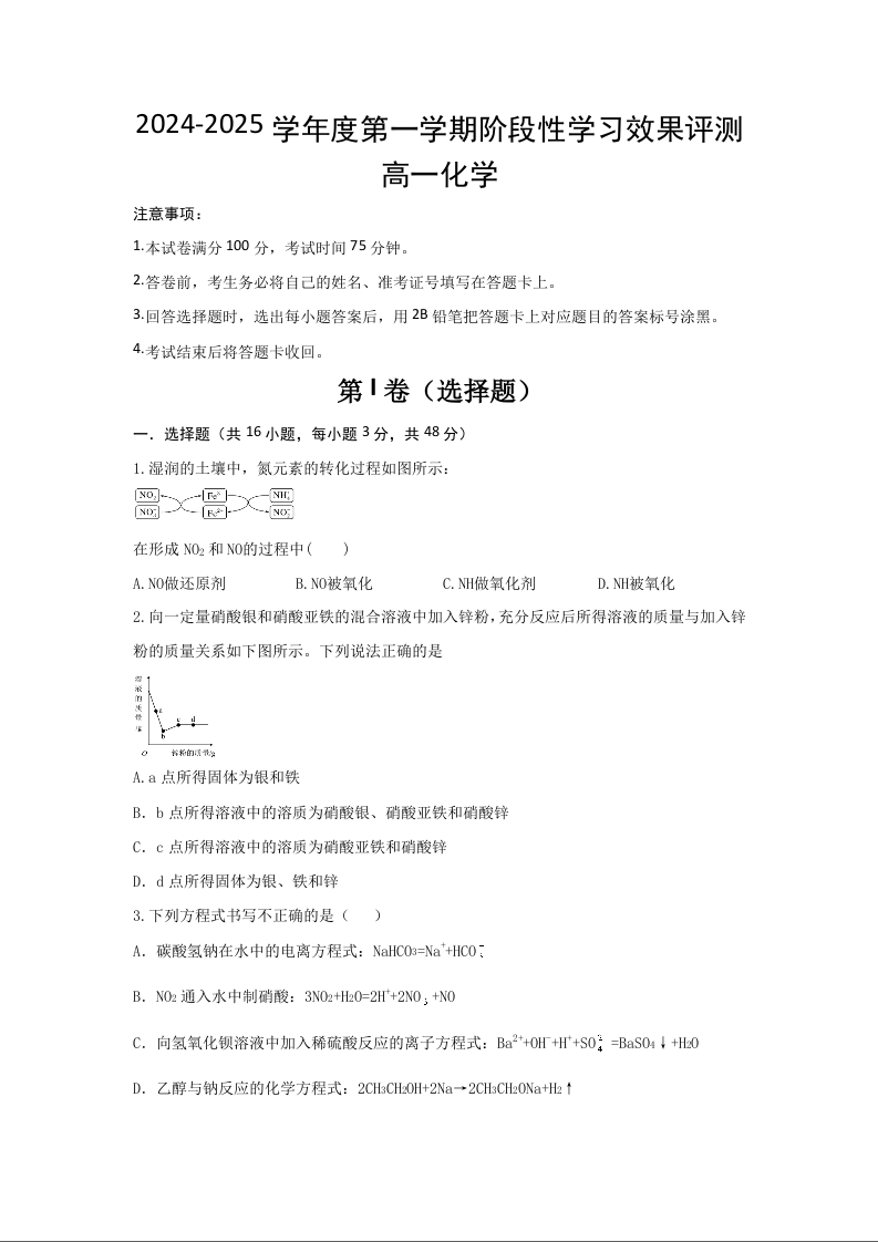 陕西省西安市部分学校2024-2025学年高一上学期12月联考化学+答案