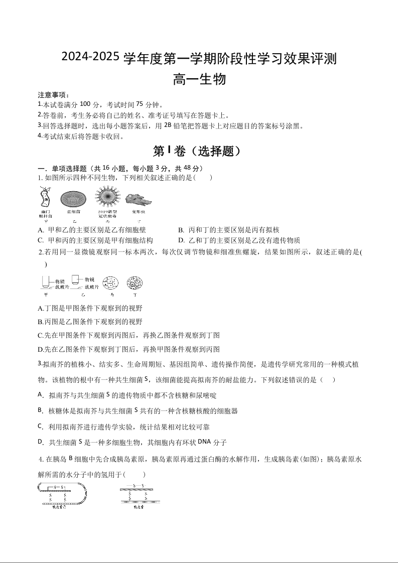 陕西省西安市部分学校2024-2025学年高一上学期12月联考生物+答案