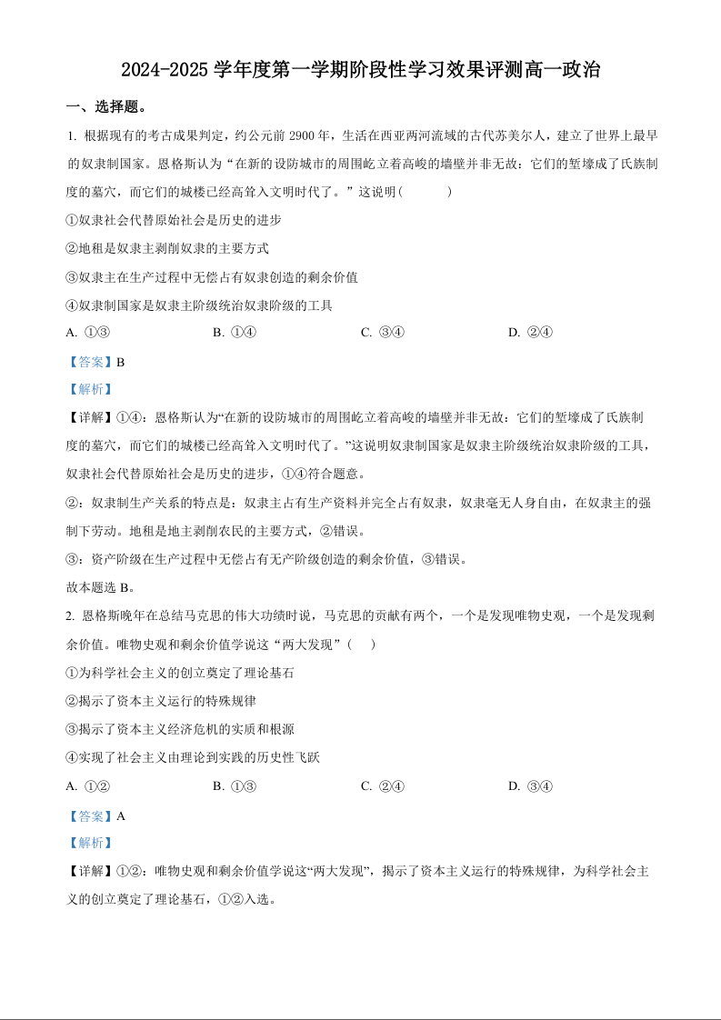 陕西省西安市部分学校2024-2025学年高一上学期12月联考政治(解析版)