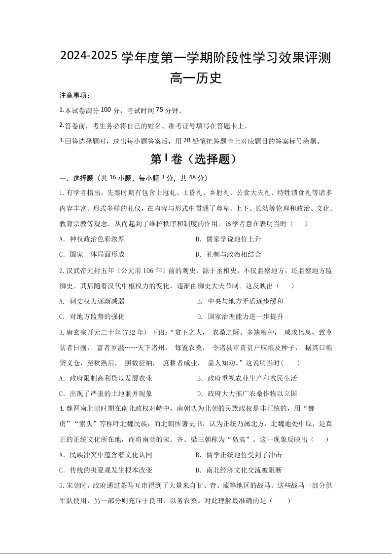 陕西省西安市部分学校2024-2025学年高一上学期12月联考历史+答案