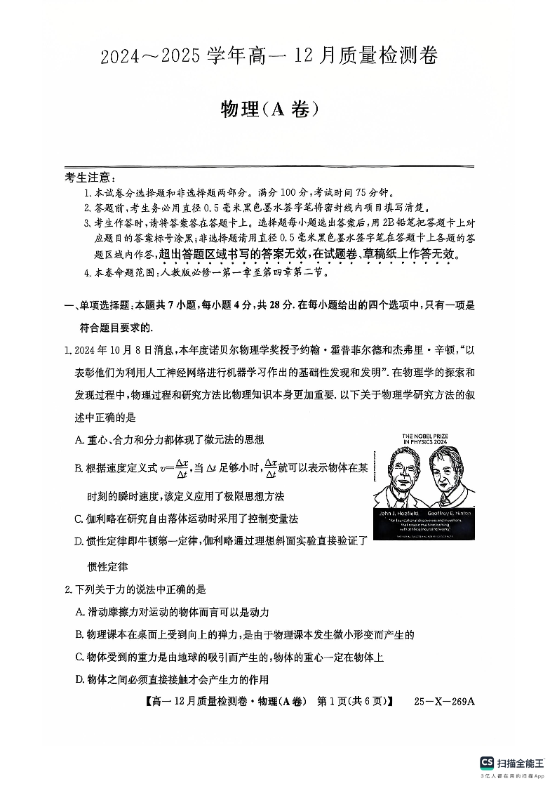 山西省三晋卓越联盟2024-2025学年高一上学期12月月考物理A