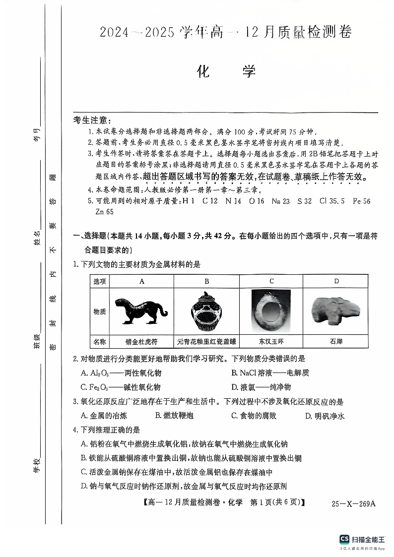 山西省三晋卓越联盟2024-2025学年高一上学期12月月考化学