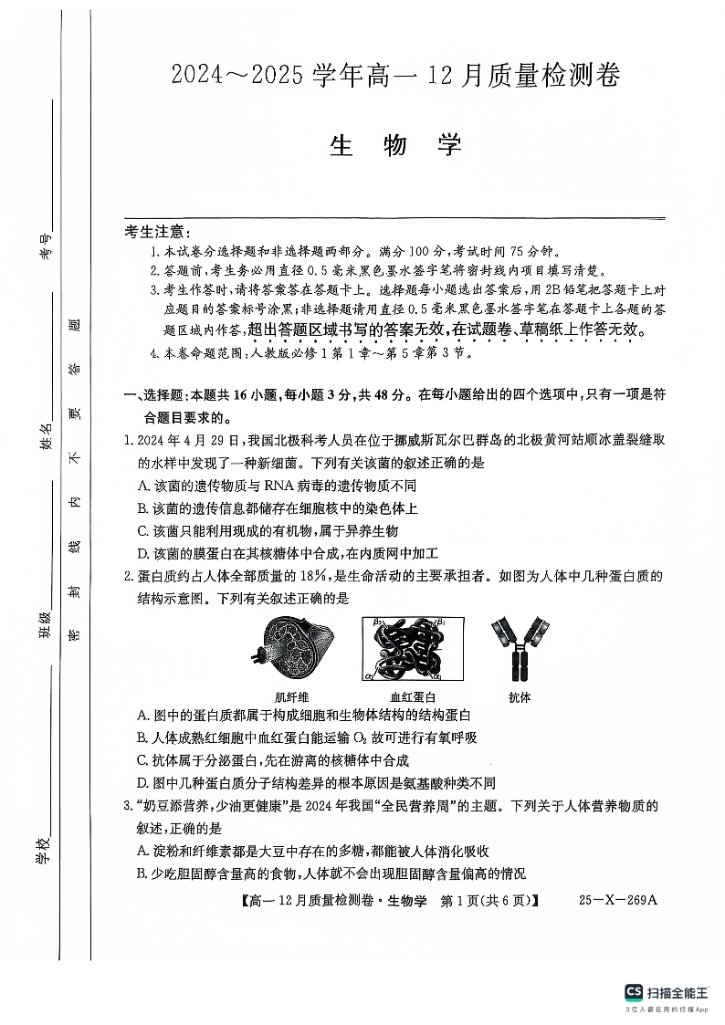 山西省三晋卓越联盟2024-2025学年高一上学期12月月考生物
