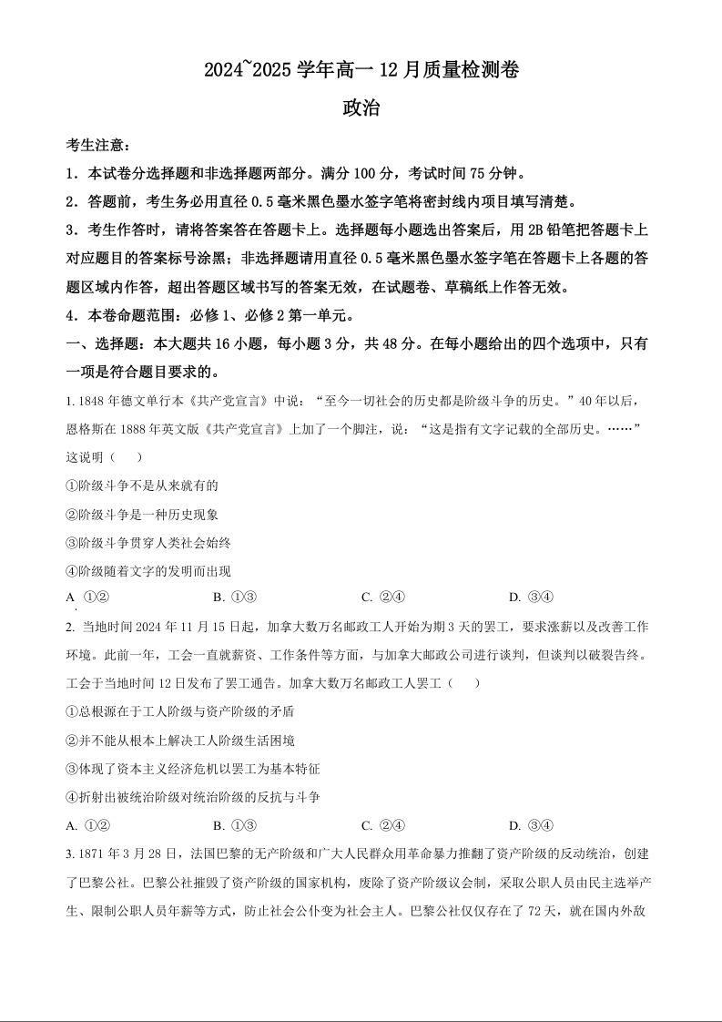 山西省三晋卓越联盟2024-2025学年高一上学期12月月考政治(原卷版)