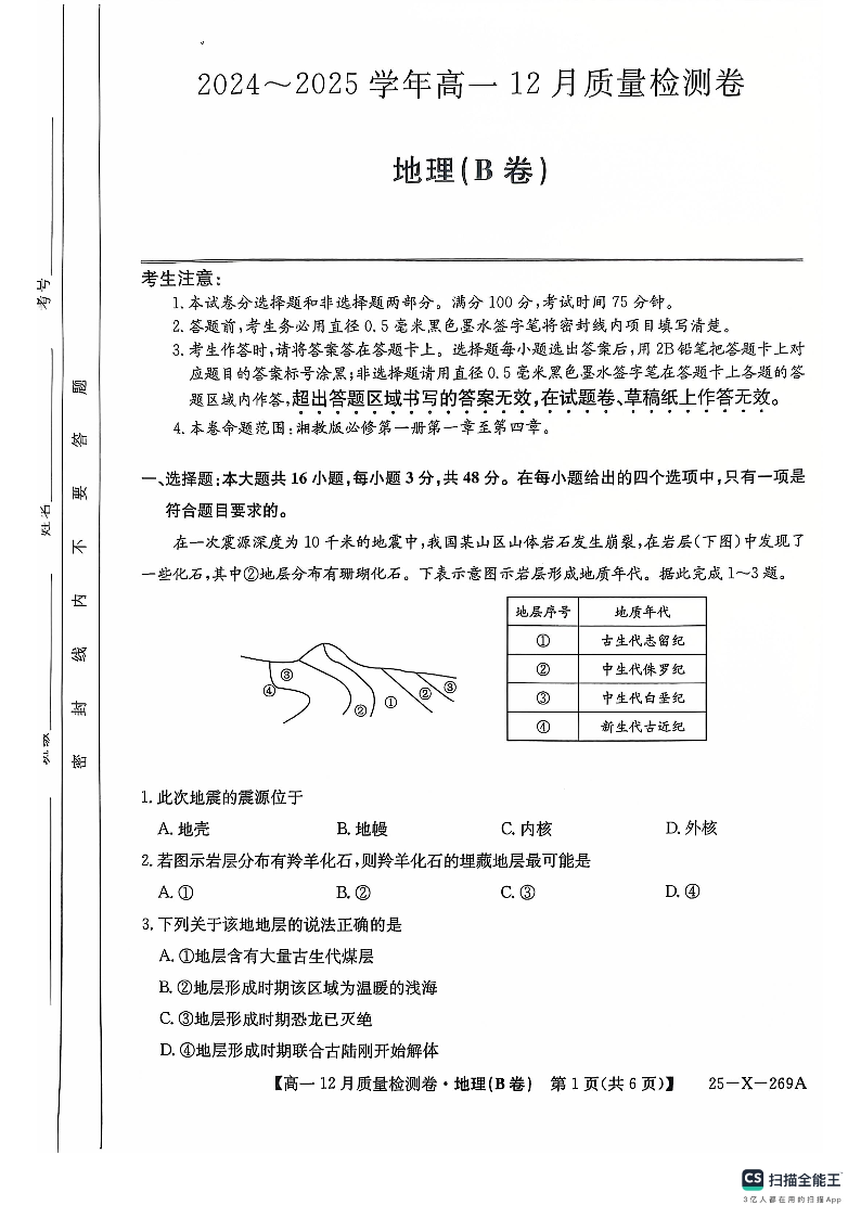 山西省三晋卓越联盟2024-2025学年高一上学期12月月考地理B