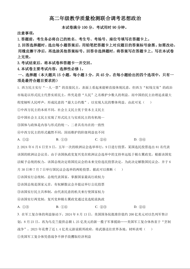 山东省部分高中2024-2025学年高二上学期12月联考政治(原卷版)