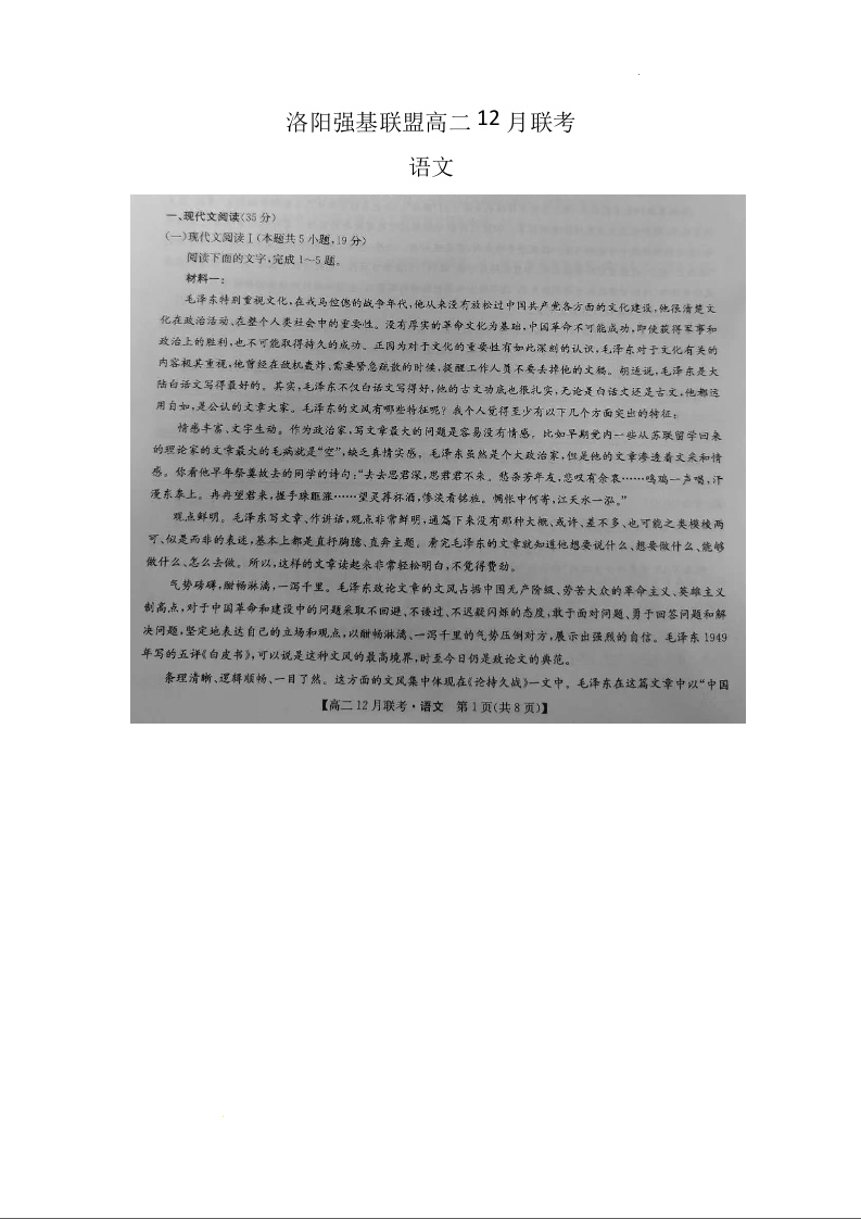 河南省洛阳市强基联盟2024-2025学年高二上学期12月月考语文