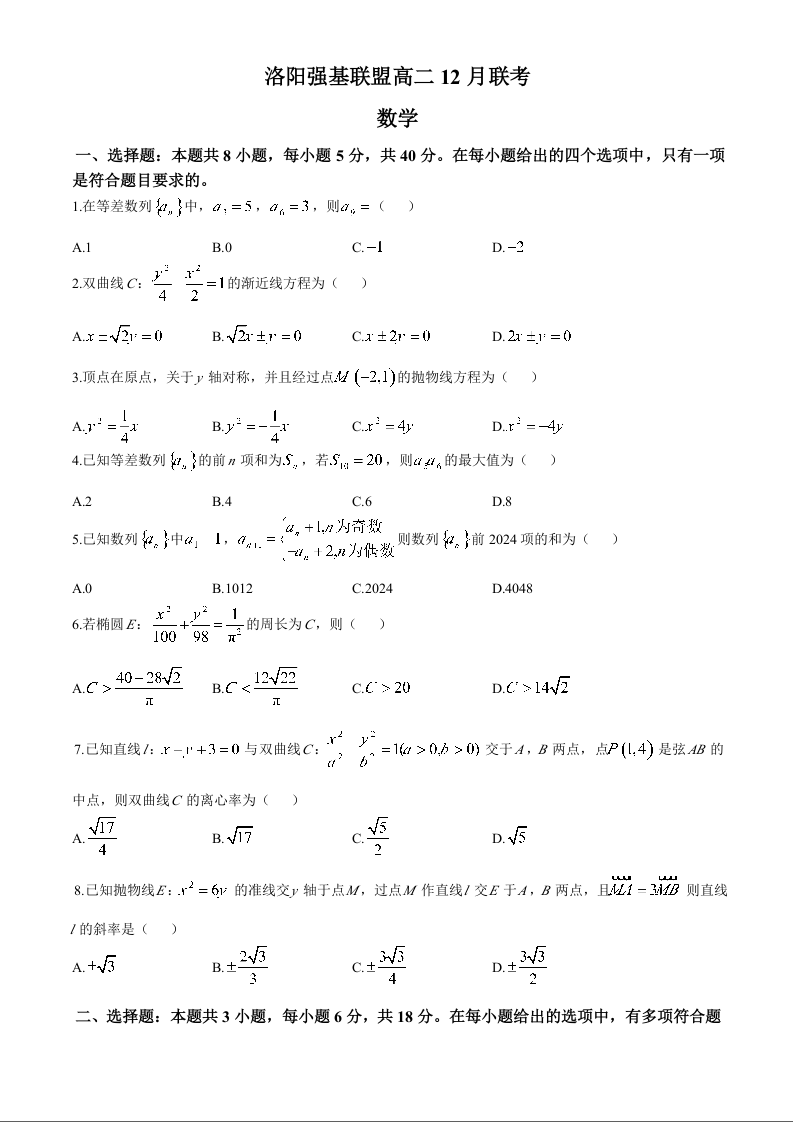 河南省洛阳市强基联盟2024-2025学年高二上学期12月月考数学+答案