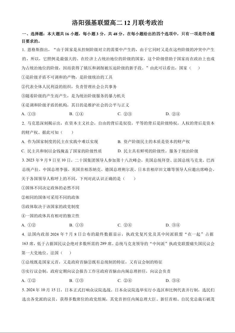 河南省洛阳市强基联盟2024-2025学年高二上学期12月月考政治(原卷版)