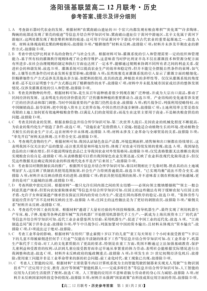河南省洛阳市强基联盟2024-2025学年高二上学期12月月考历史答案