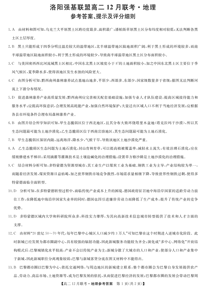河南省洛阳市强基联盟2024-2025学年高二上学期12月月考地理答案
