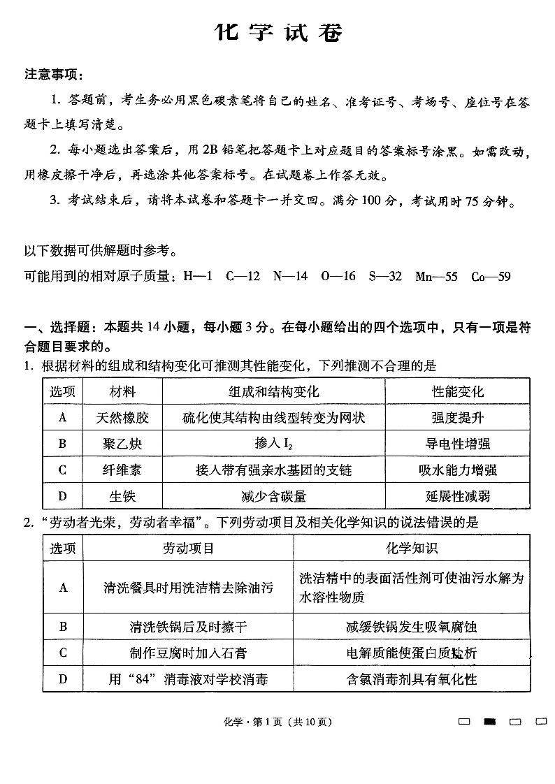 云南师范大学附属中学2025届高考适应性月考卷(七)化学