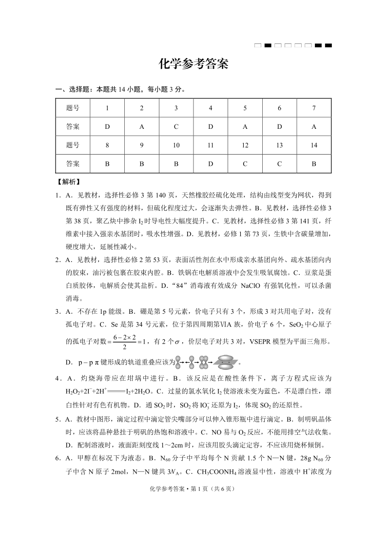 云南师范大学附属中学2025届高考适应性月考卷(七)化学答案