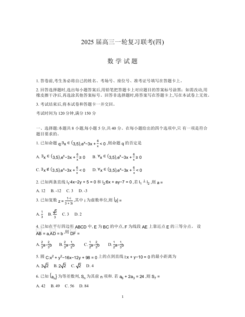 河北省区域高中2025届高三年级一轮复习联考(四)数学B