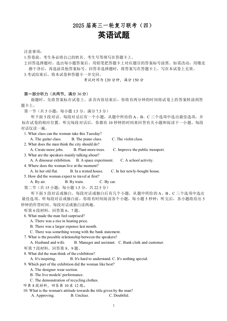 河北省区域高中2025届高三年级一轮复习联考(四)英语