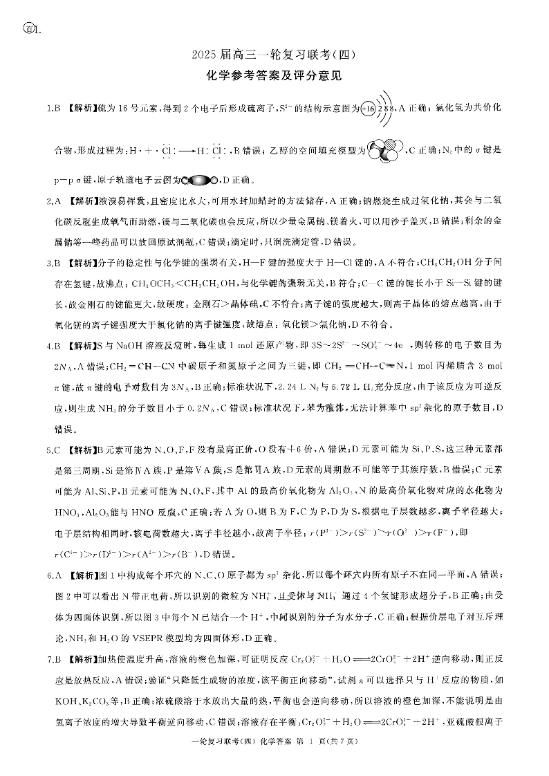 河北省区域高中2025届高三年级一轮复习联考(四)化学答案